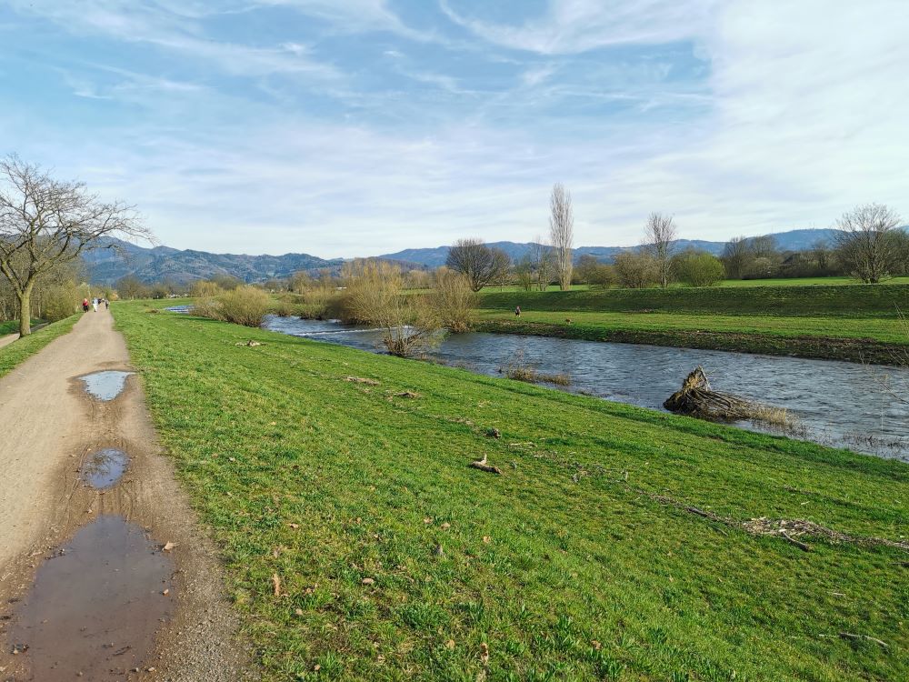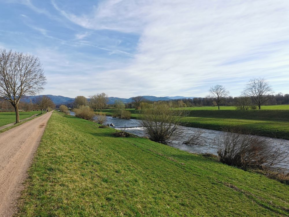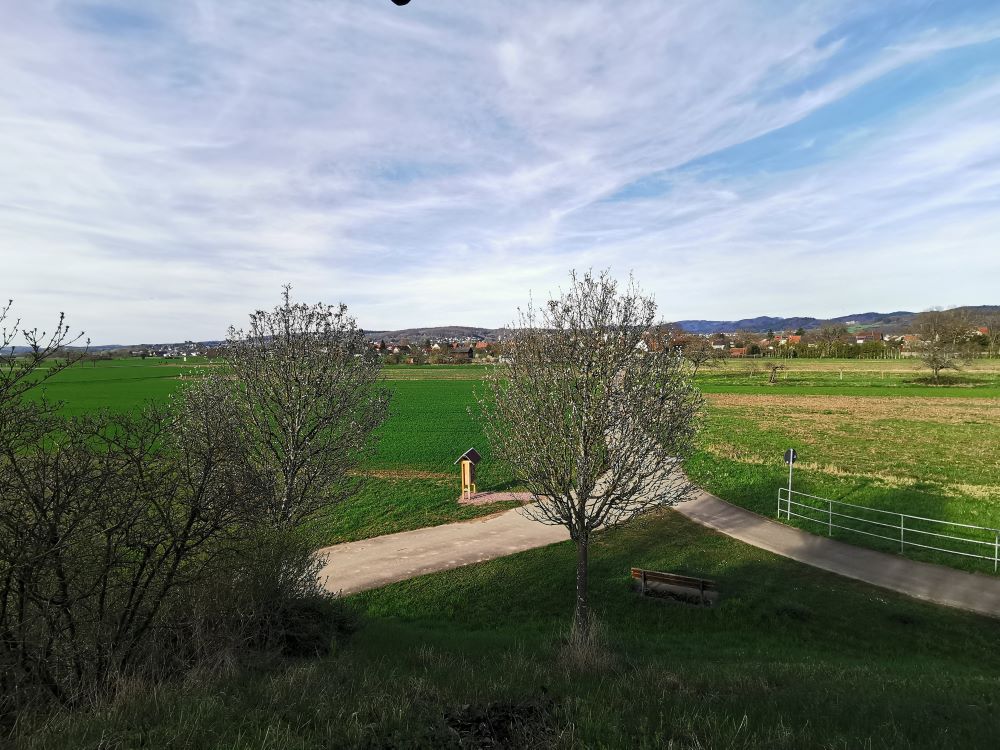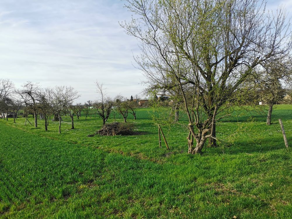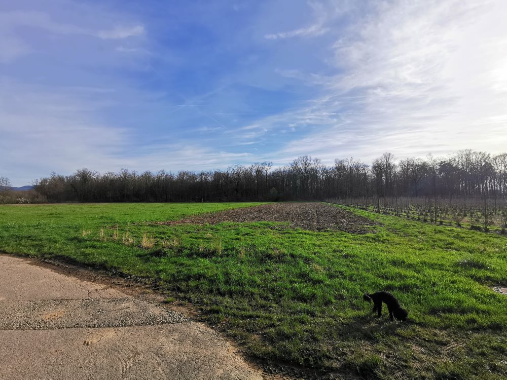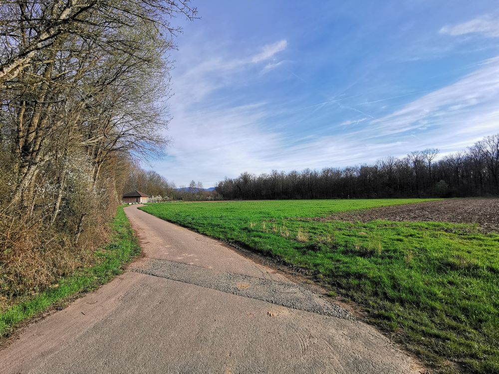 Baugrundstück mit angrenzendem FeldStreuobstwiese mit Blick zum GrundstückBlick auf WasserFelder angrenzend ans BaugrundstückFeld mit Storchenturm im HintergrundSpazierweg / Radweg neben dem GrundstückGeteerter Rad- und Spazierweg Richtung Denzlingen/ Freiburg durch den Wald